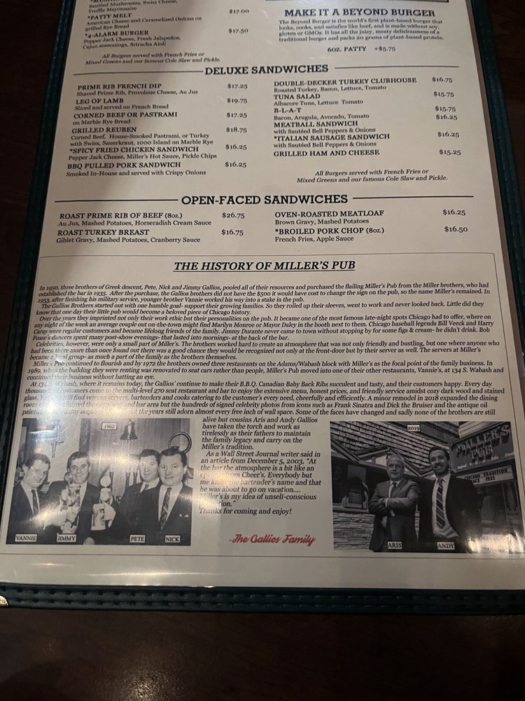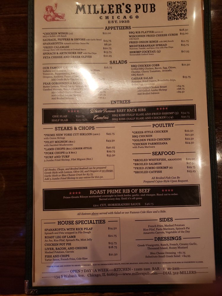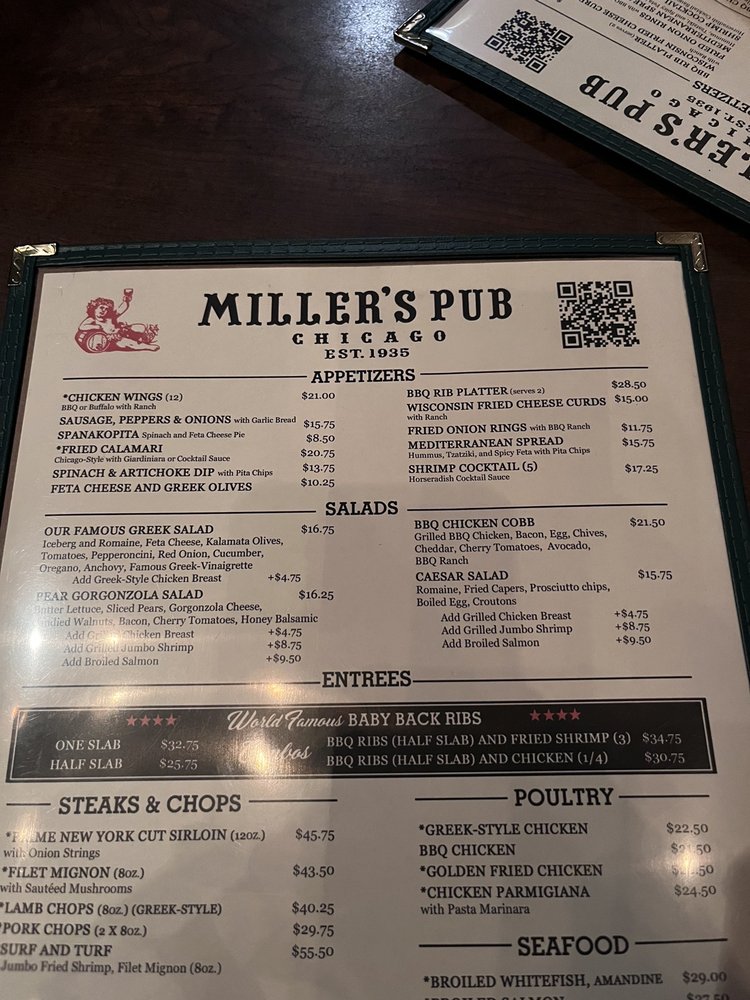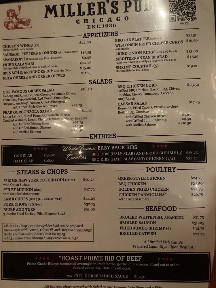 Miller's Pub in Chicago is a quintessential American pub that offers a variety of dishes that cater to different tastes. The appetizers such as the Sausage, Peppers and Onions and the Wisconsin Fried Cheese Curds are flavorful starters that set the tone for a satisfying meal. The Canadian Baby Back Ribs are a standout, with options for different portions and combos. The burger selection is impressive, with options like the Mushroom Truffle Burger and the Reuben Burger showcasing unique flavors. The Mediterranean Spreads and Spanakopita provide a taste of Greek influence in the menu. The reviews from customers praise the generous portions and friendly service at Miller's Pub, making it a must-visit for those craving hearty pub fare in a lively atmosphere.
